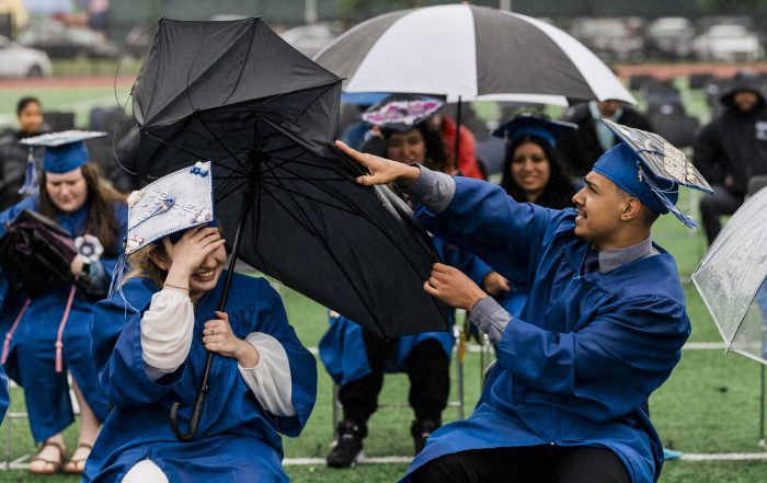 Graduates, some bundled up in weatherwear more appropriate for early April and others wielding larger-than-life umbrellas, contemplated their legacies as leaders during the charter school’s ceremony at Manning Field.