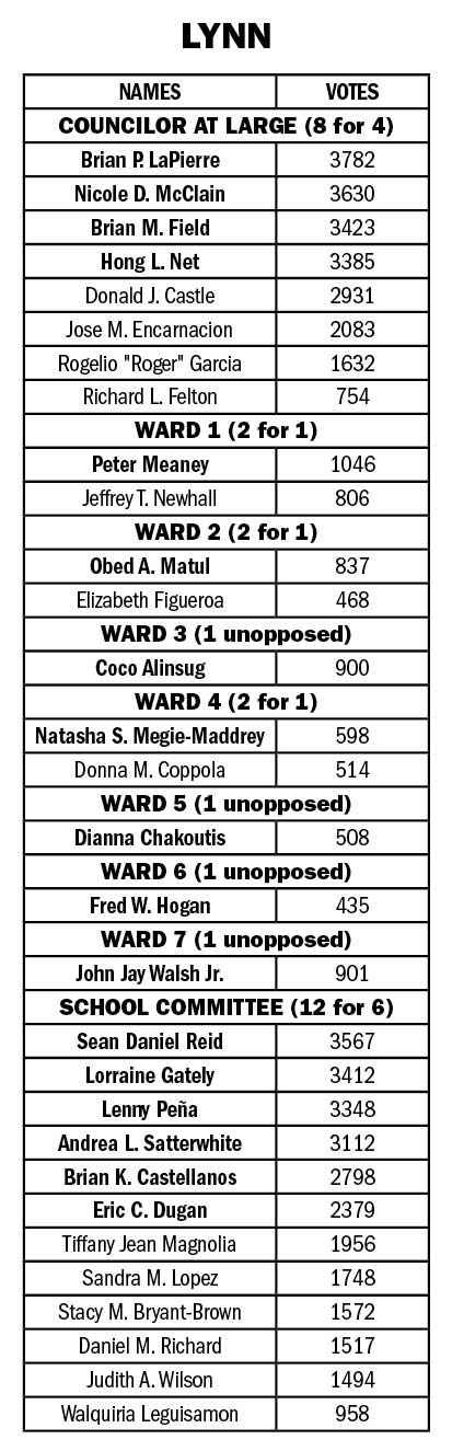 In the councilor-at-large race, the top four vote-getters were incumbents Brian LaPierre, Nicole McClain, Brian Field, and Hong Net, in that order.