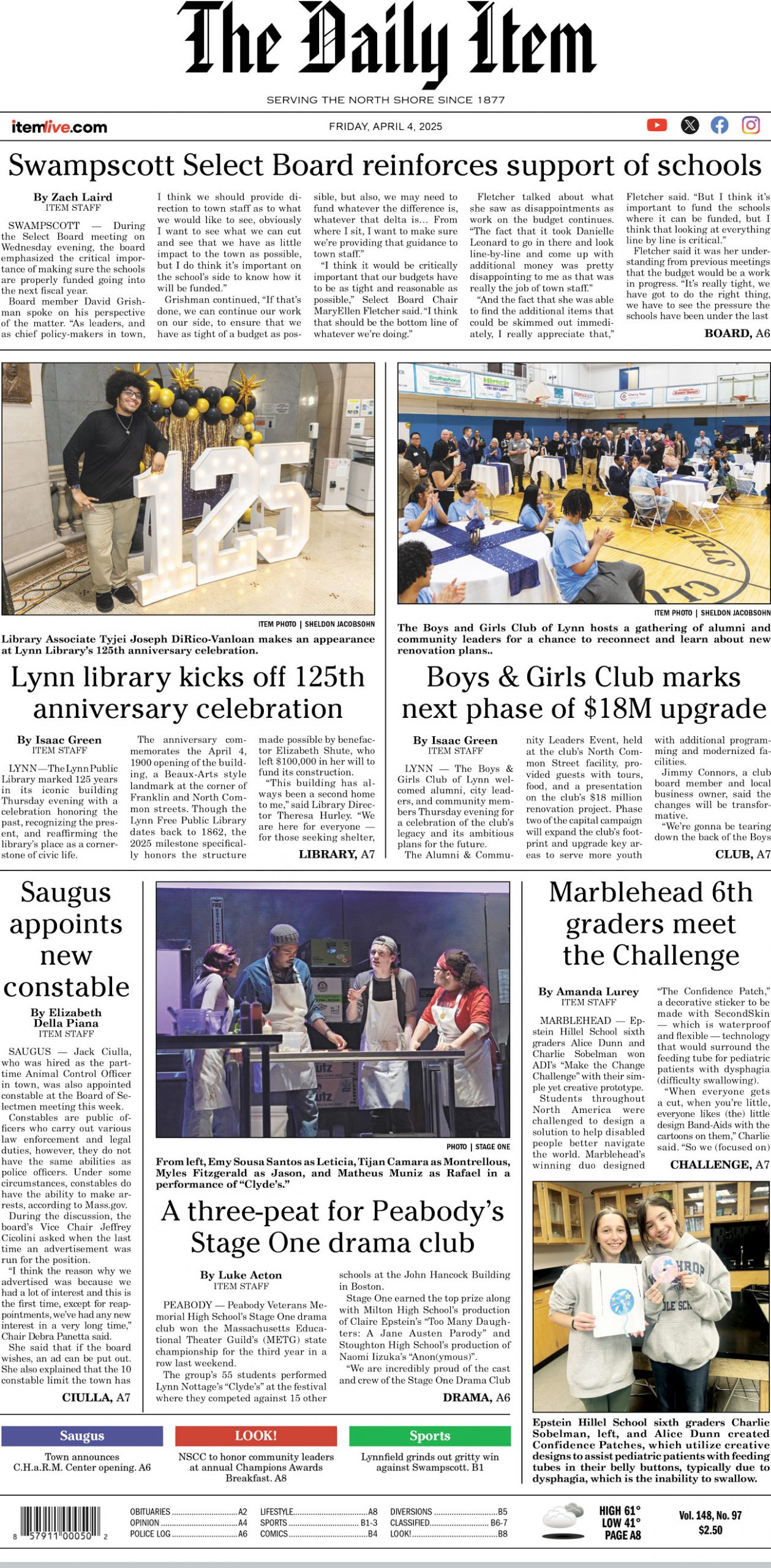 Today’s page 1: 4-4-25 Daily Item StaffApril 3, 2025 by Daily Item Staff Daily Item Staff View all posts Related posts: No related posts.