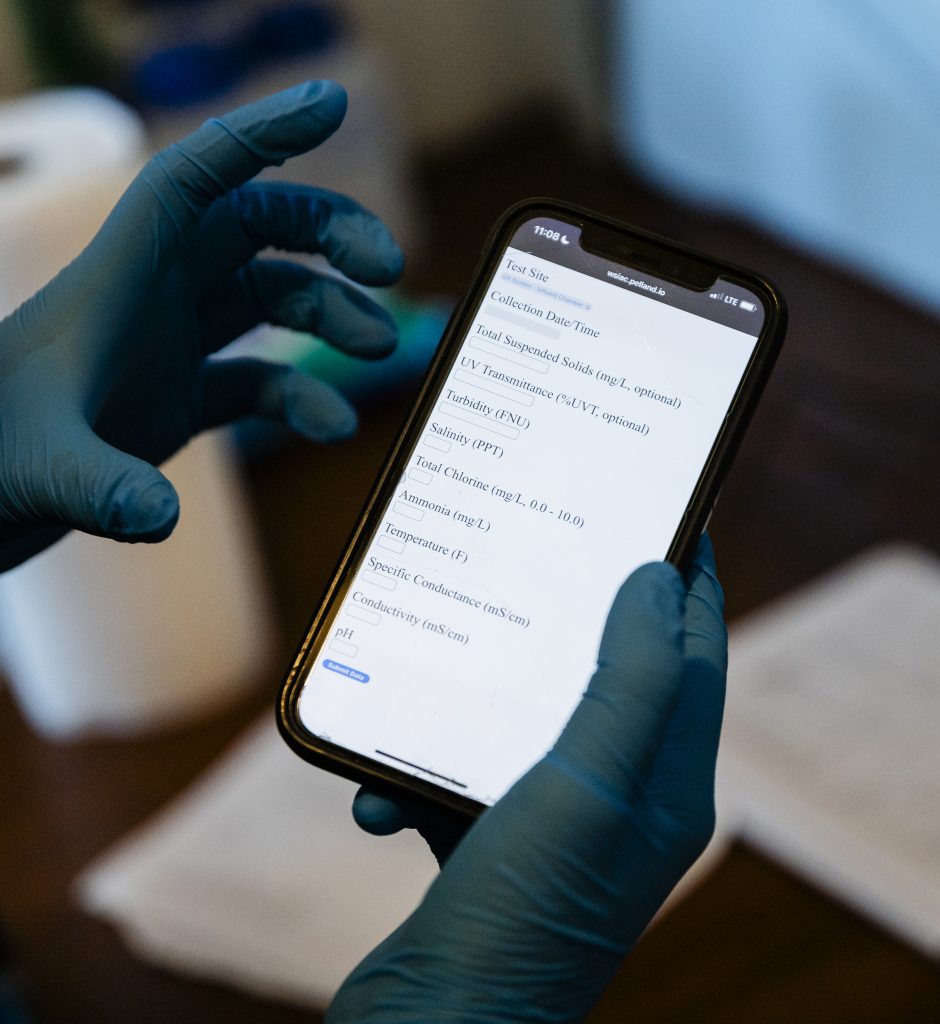 Benedetto started testing the different buckets of water for ammonia while Martinez got ready to put on some heavy-duty green waders. He was tasked with going into the water to collect a sample and bring it back for testing.