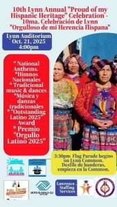 The event will consist of a parade of flags from Lynn Common to the Lynn Auditorium and a ceremony of poetry, music, and dances from several Latin countries. Awards will be given to Outstanding Latino and Latino Pride recipients, followed by a reception.