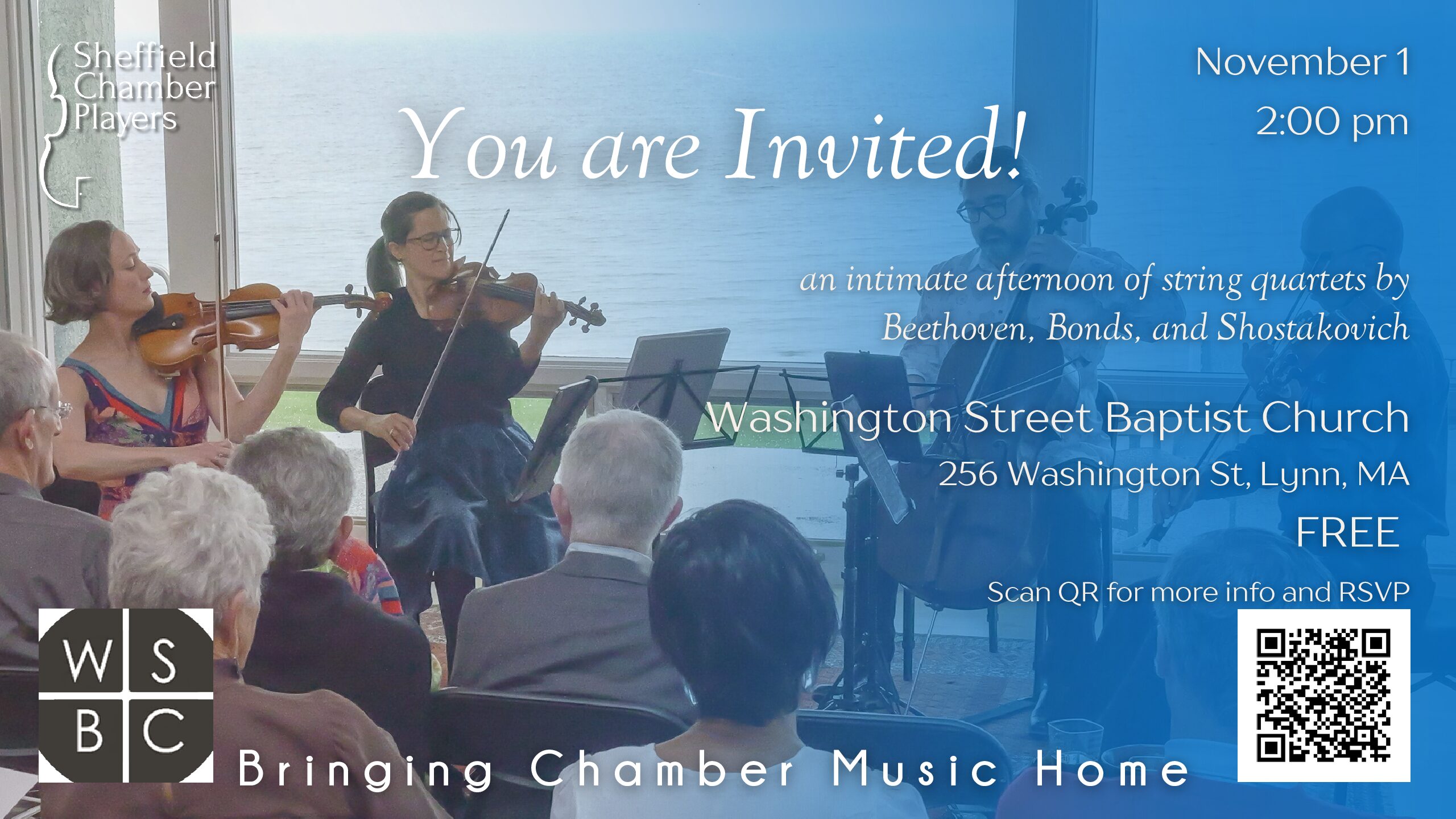 Sheffield Chamber Players was founded in 2014 on the belief that chamber music is a powerful tool for connection and community. Inspired by 19th century music salons, they perform diverse repertoire in intimate settings — most often private homes — profoundly changing the way listeners gather, respond to the music, and connect through a shared artistic experience. The group is excited to open their 12th season with a new collaboration with the vibrant community space of the Washington Street Baptist Church in Lynn.