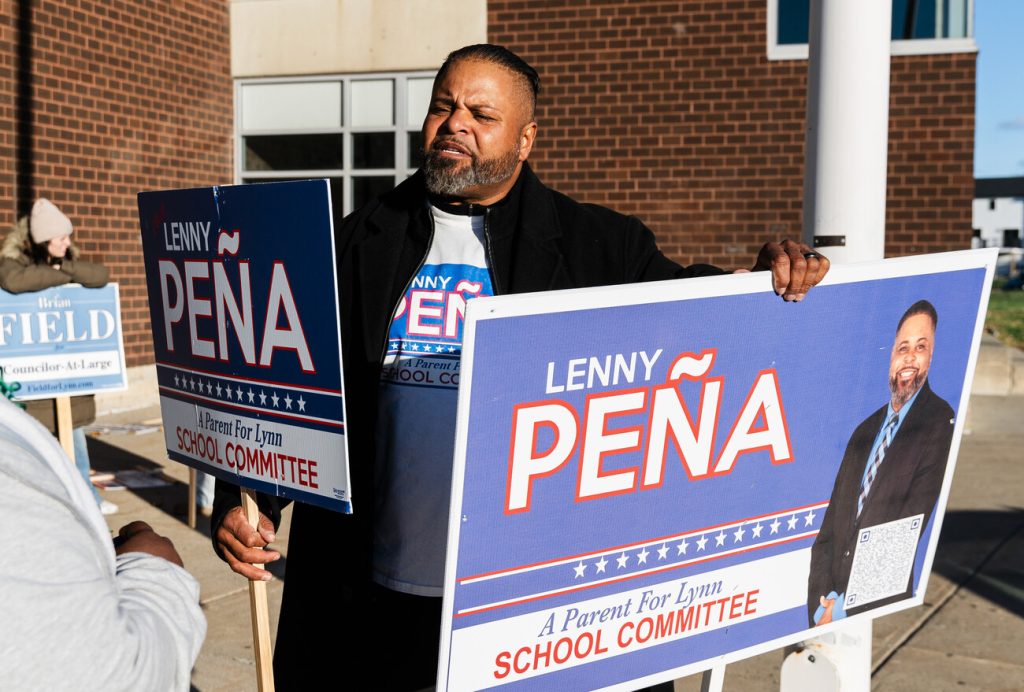 Lynn School Committee challenger Tristan Smith campaigns outside Sisson Elementary School with School Committee incumbent Lorraine Gately and her son, Michael.