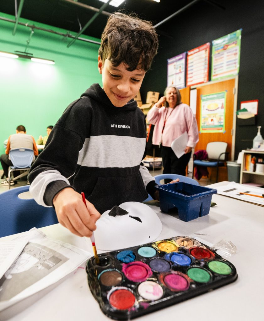 Rayniel M., is all smiles as he paints his mask for a play he's working on with the LEAP for Education drama group at Thurgood Marshall Middle School in Lynn on Wednesday.