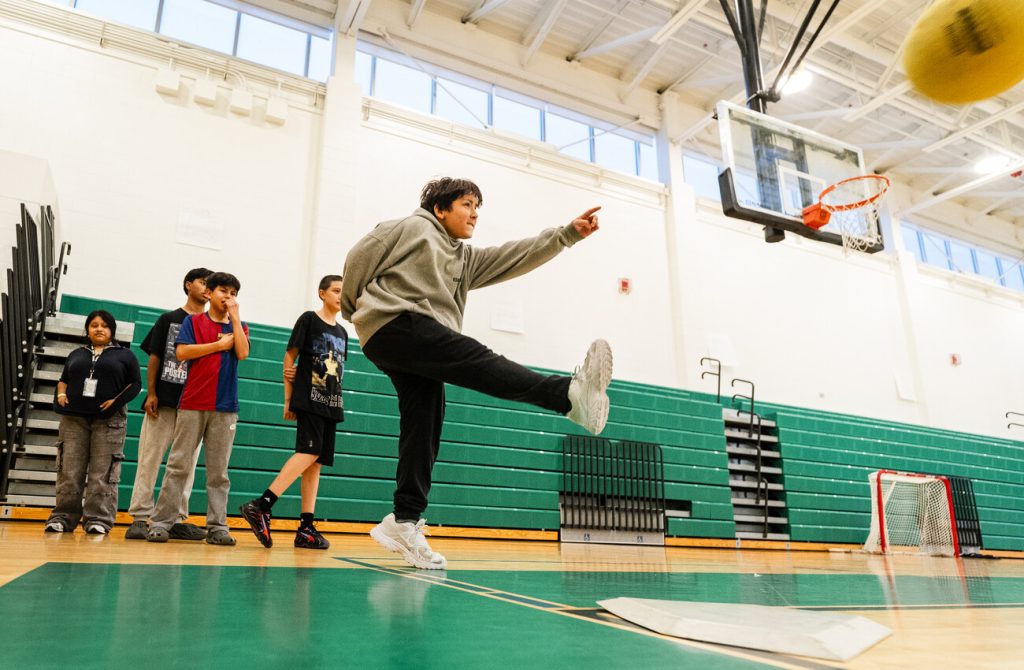 Michael D., launches the ball as the LEAP for Education physical fitness group plays in the gym at Thurgood Marshall Middle School in Lynn on Wednesday.