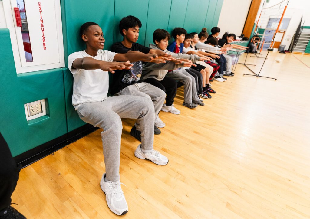 Kareal L., left, and the rest of the LEAP for Education physical fitness group perform wall-sits during the after school program at Thurgood Marshall Middle School in Lynn on Wednesday.