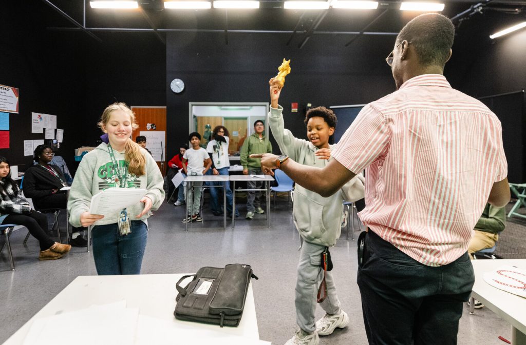 LEAP for Education Dram Enrichment Facilitator Lemar Archer guides the group through prop making at Thurgood Marshall Middle School in Lynn on Wednesday.