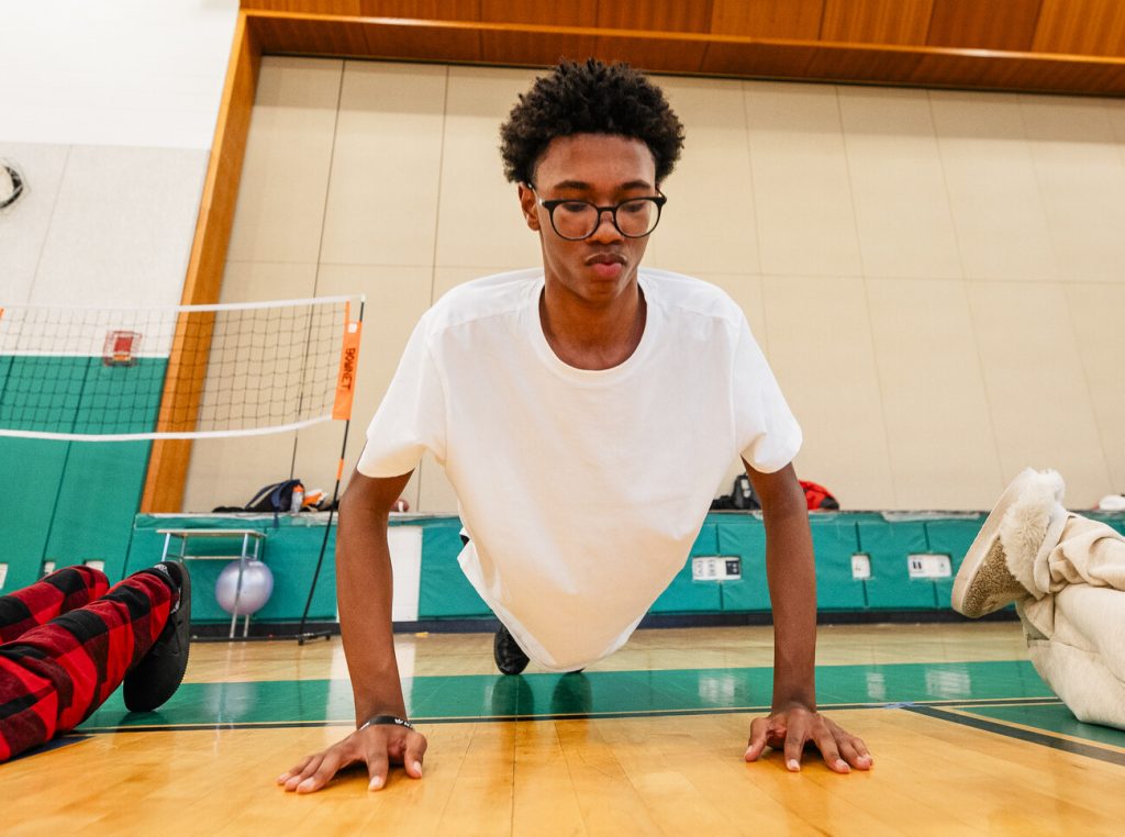 Diego M., works on his push-up form during the LEAP for Education after school program at Thurgood Marshall Middle School in Lynn on Wednesday.