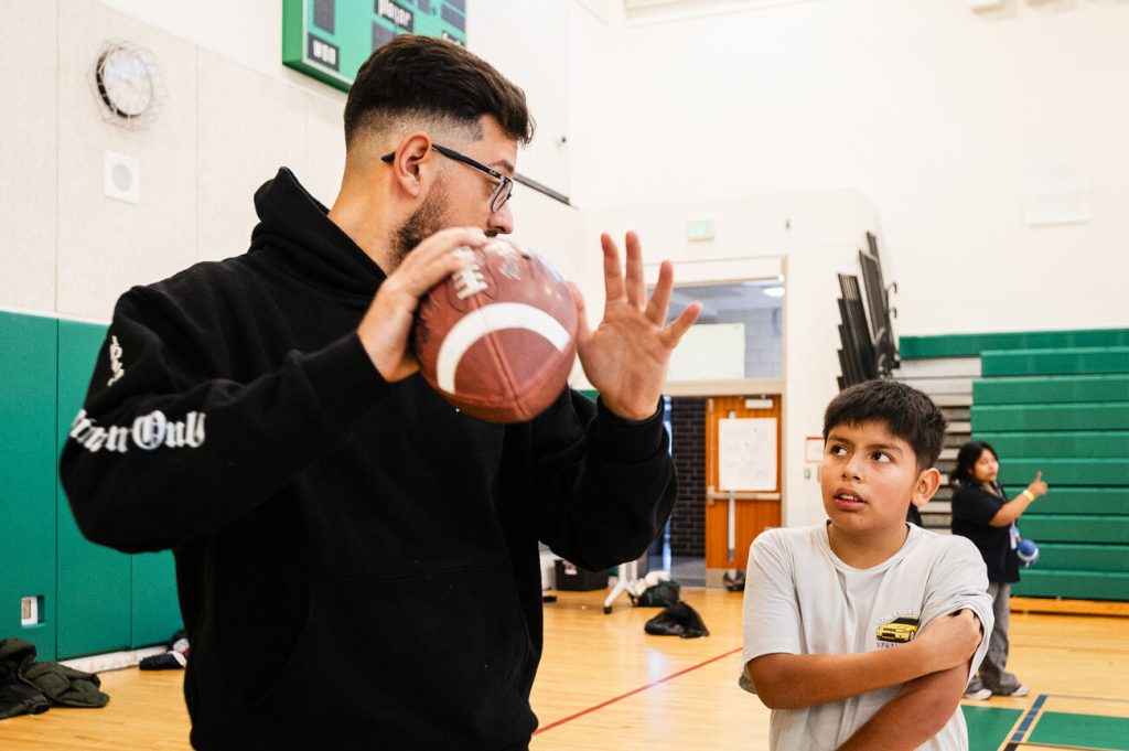LEAP for Education Enrichment Facilitator Mike Scarfo teaches John B., how to throw a spiral during the after school program at Thurgood Marshall Middle School in Lynn on Wednesday.