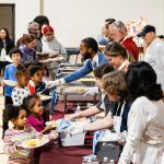 Each family of three or more people received a reusable grocery bag filled with rice, corn, black beans, onions, and boxes of stuffing, cornbread, and brownie mix. Families also received a $20 gift card to purchase a turkey.