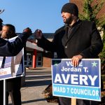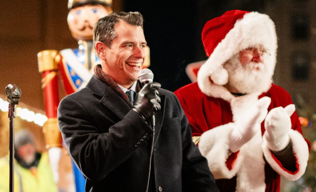 Lynn Mayor Jared Nicholson speaks during the Festival of Lights in Central Square as Santa claps behind him.