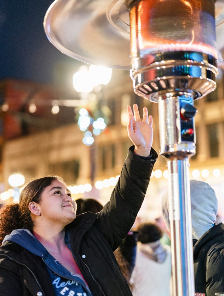 Amy Munoz was grateful for the portable heaters during a very chilly Festival of Lights in Lynn Monday night.