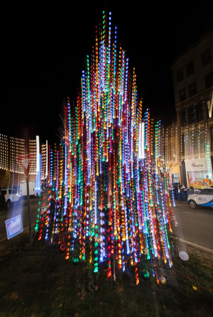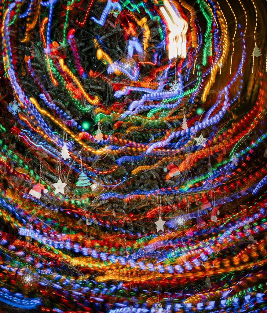 A long exposure captures the colored lights and handmade ornaments on the Central Square Christmas tree during Lynn's Festival of Lights.