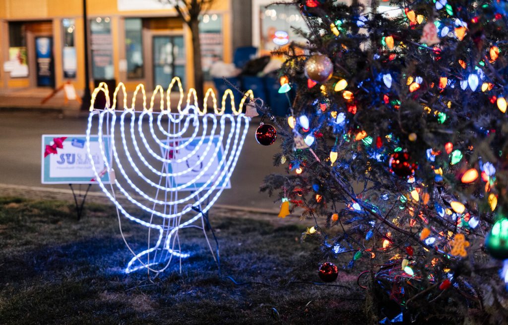 The minorah and Christmas tree come to life during Lynn's Festival of Lights in Central Square on Monday.
