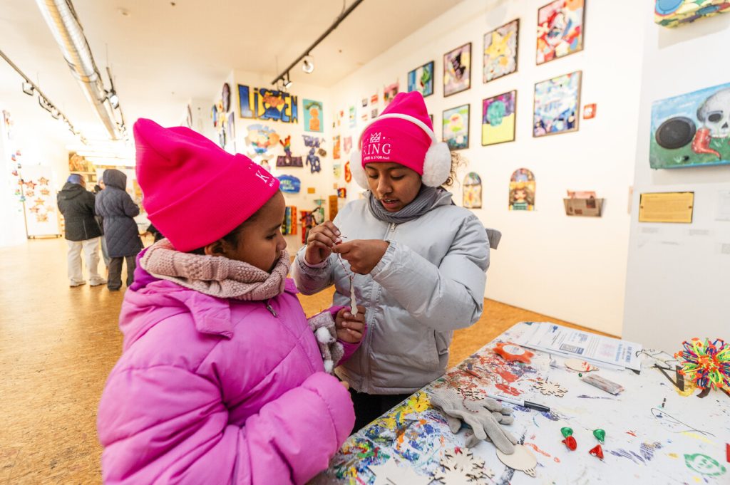 Tessa Aguilar, right, helps her sister, Tara, put the finishing touches on her Christmas ornament at Raw Art Works during Lynn's Festival of Lights on Monday.