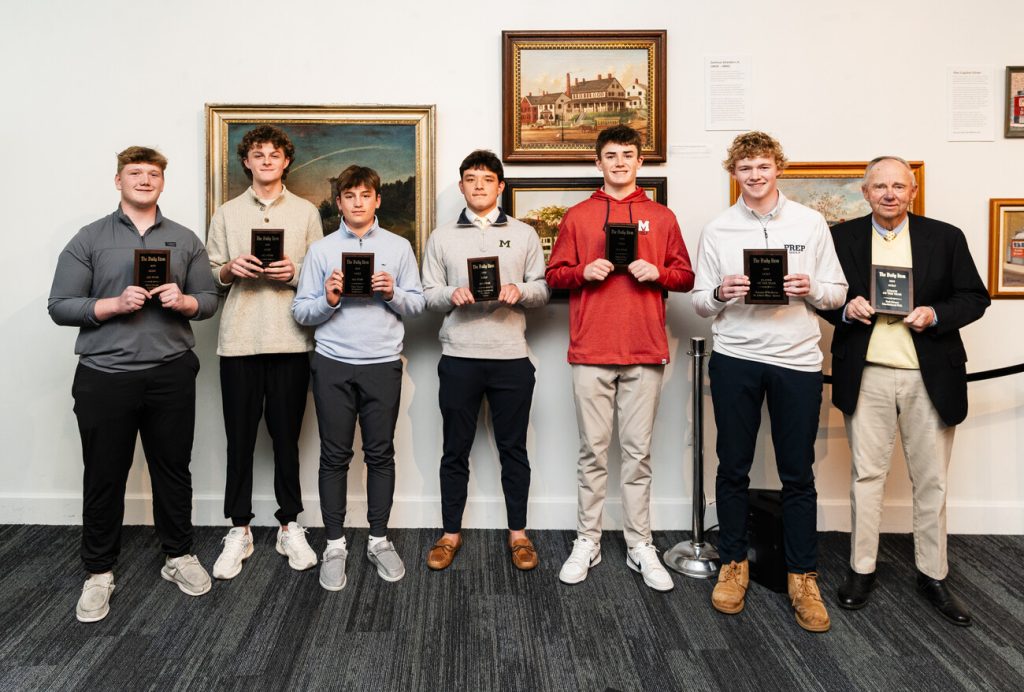 Receiving Fall 2025 Item All-Stars awards for golf were, from left, Lynnfield’s Drew George, Lynn English’s Riley Driscoll, Swampscott’s Tyler Ostroff, St. Mary’s Micah Hashikawa, Marblehead’s Tyler Forbes, Player of the Year St. John’s Seamus O’Holleran, and Coach of the Year Marblehead’s Bob Green.