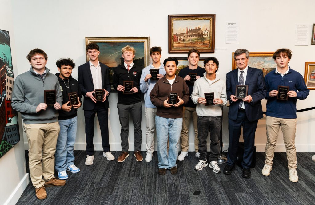 Receiving Fall 2025 Item All-Stars awards for boys soccer was, from left, Marblehead’s Miles Fontela-Tuttle, Lynn Classical’s Edison Chacón, St. John’s Matt Droggitis, Player of the Year St. John’s Garrison Murphy, Lynnfield’s Rocco Scenna, KIPP’s Jossue Giron, Swampscott’s George Spellios, Saugus’ Carlos Miranda, and Coach of the Year St. John’s Dave Crowell.