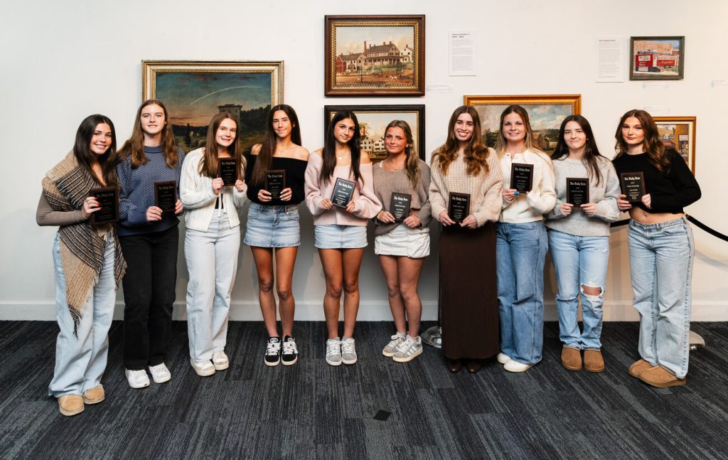 Receiving Fall 2025 Item All-Stars award for girls soccer was, from left, Player of the Year St. Mary’s Sophie Skabeikis, Marblehead’s Ainsley McDonald, St. Mary’s Cameryn Dunn, Lynnfield’s Kaylee Barrett, Lynnfield’s Giada Antidormi, Lynnfield’s Ava Damiani, Marblehead’s Sydney Ball, Swampscott’s Greta Siefken, Swampscott’s Eve Byrne, and Saugus’ Shalyn Sewell