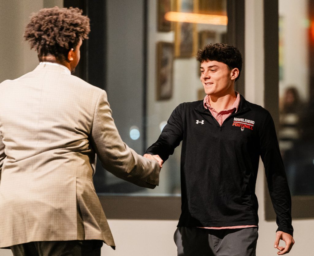 Item Sports writer Mark Aboyoun shakes hands with Marblehead's Finn Gallup as he presents him with his 2025 Item All-Stars award for football.