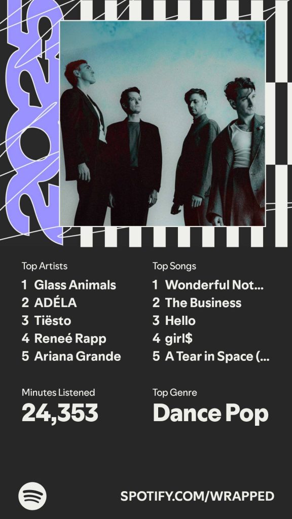 I’m always most excited for my top songs. They are as follows: “Wonderful Nothing” by Glass Animals, “The Business” by Tiësto, “Hello” by Martin Solveig and Dragonette, “girl$” by Dom Dolla, and “A Tear in Space (Airlock)” by Glass Animals.