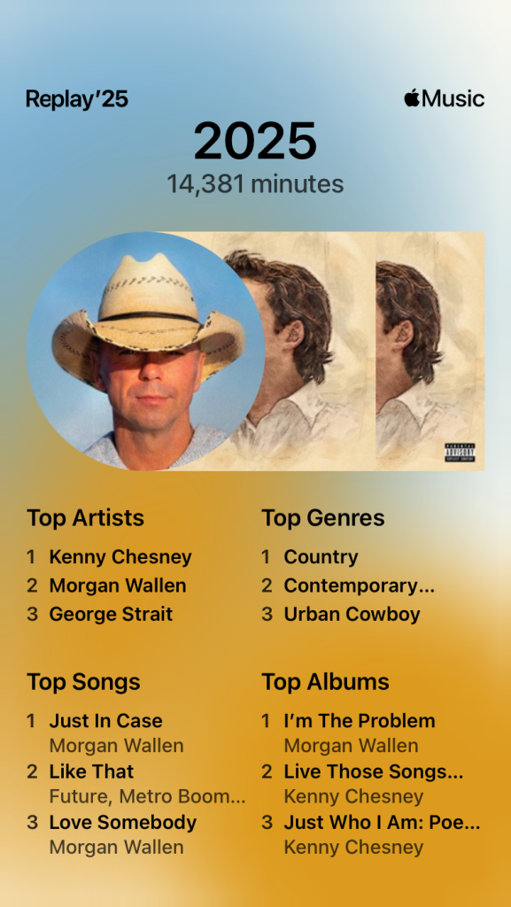 My top artists of the year were Chesney, “King of Country” George Strait, modern-day king Morgan Wallen, Alan Jackson, and Post Malone (rapper-turned-country musician).