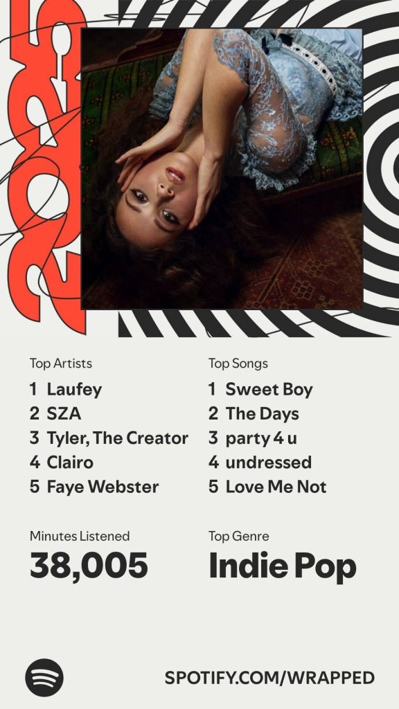 At the top of my artist lineup sits Laufey, reigning like the patron saint of cozy introspection. Following close behind are SZA and Tyler, The Creator, proof that my emotional range this year stretched from heart-spilled confessions to vibrant, creative chaos. Rounding out the top five were Clairo and Faye Webster, artists who specialize in making everyday moments feel cinematic, even when I’m just staring out a bus window pretending to be in an A24 film.