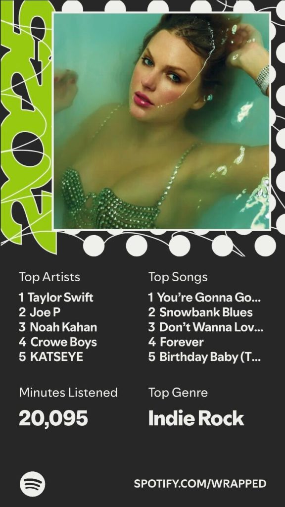 My top five included Swift at number one, followed by indie rock influence Joe P, Noah Kahan, Crowe Boys (some of the only country I enjoy), and KATSEYE.