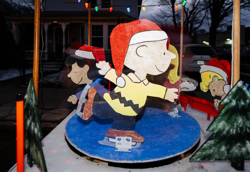 Charlie Brown is joined by his friends as they skate around a float in Lynn's Christmas Eve Parade.