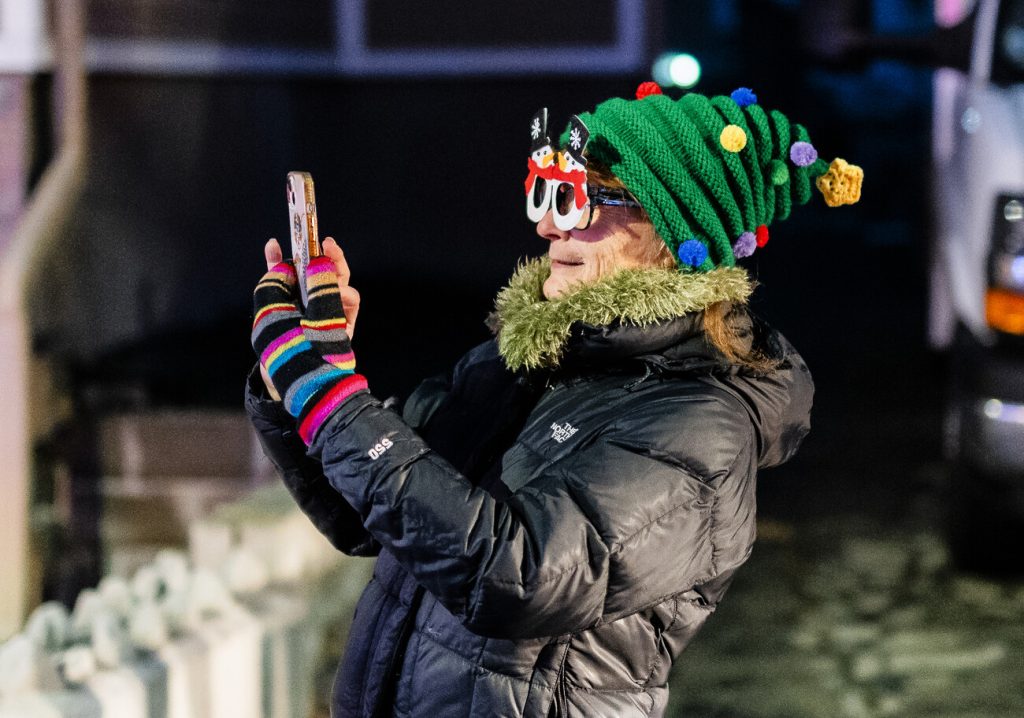 Vicky Lane takes a photo of her friends Jay and Yvonne Ramsey with a float in the Lynn Christmas Eve Parade.