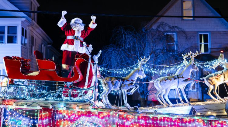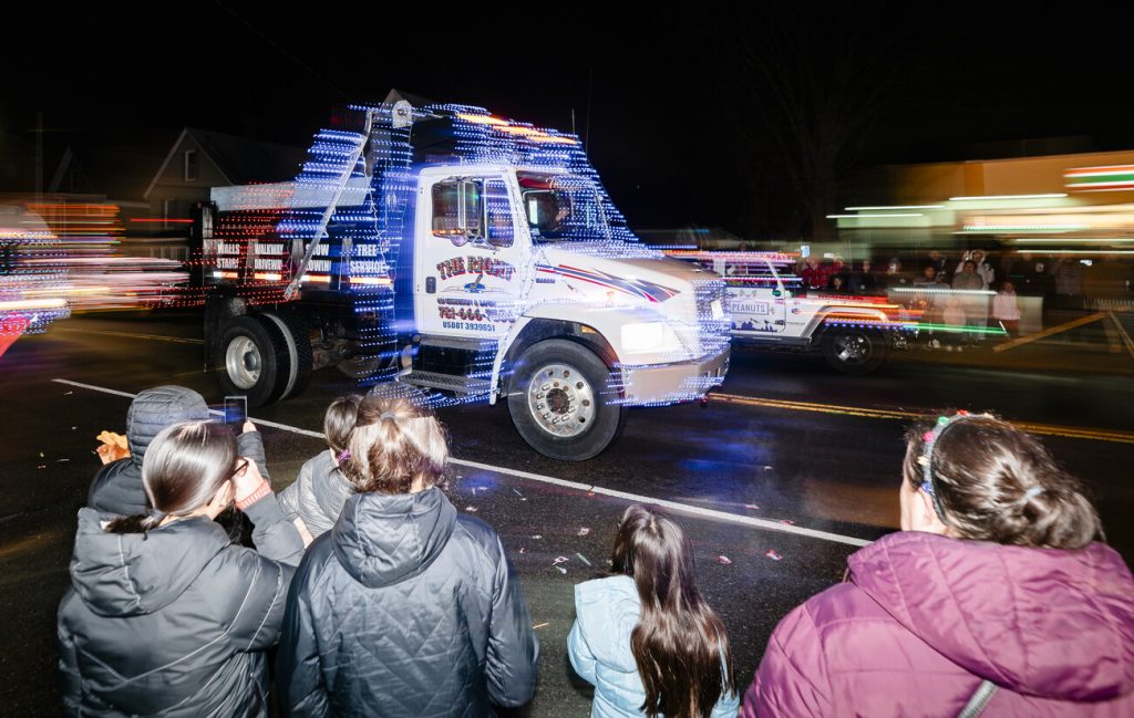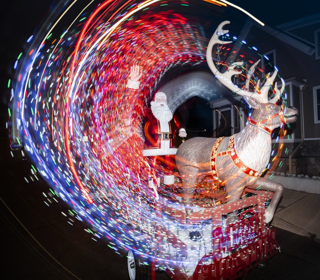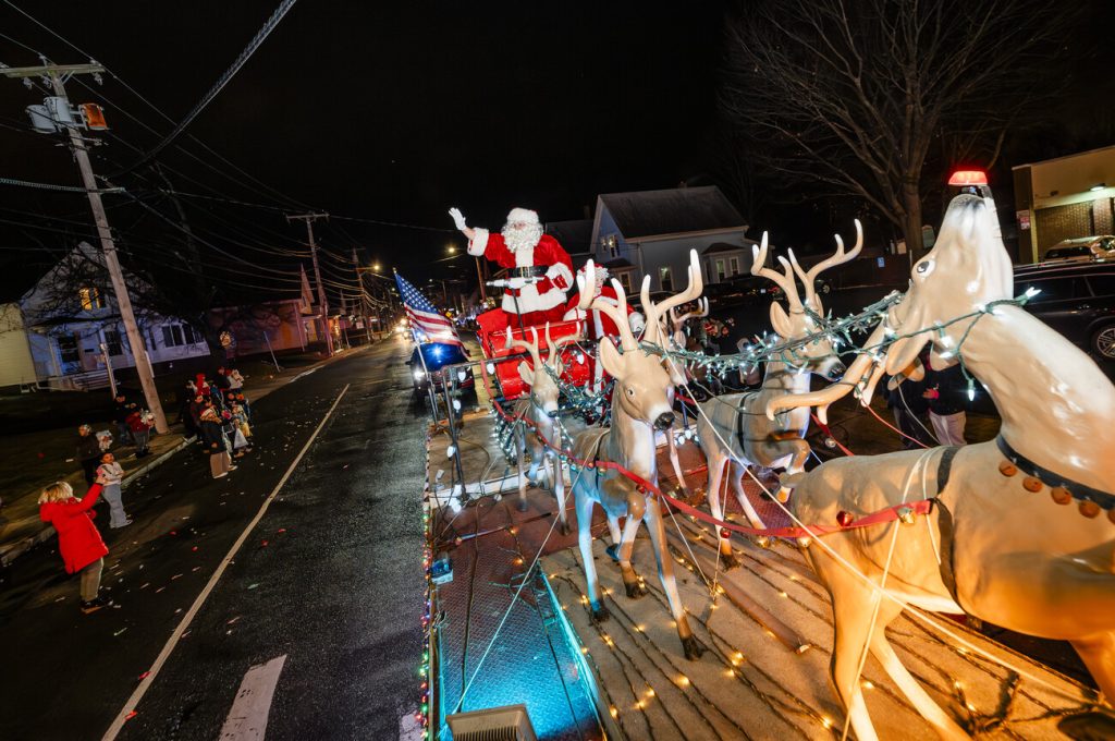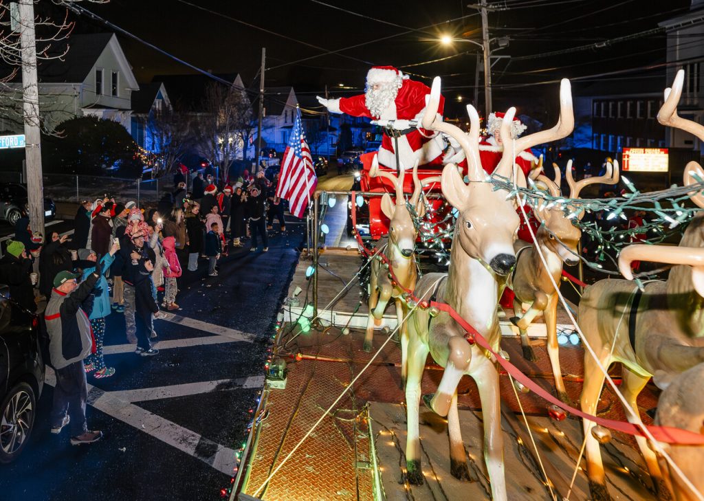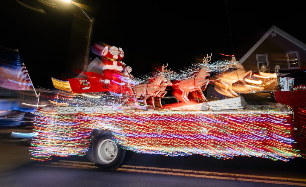 A truck with Santa and his reindeer on top rushes to line up for Lynn's Christmas Eve Parade.