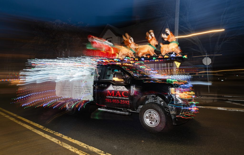 A dump truck drives down Summer Street during Lynn's Christmas Eve Parade.