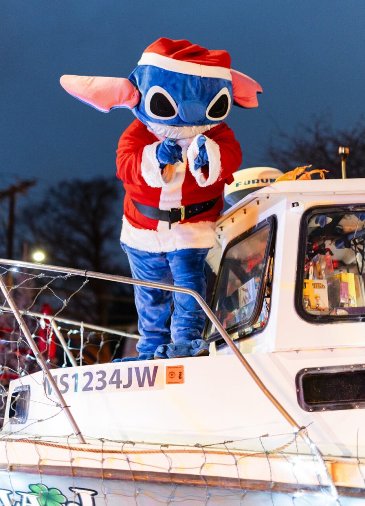 Stitch looks out from a boat float during Lynn's Christmas Eve Parade.