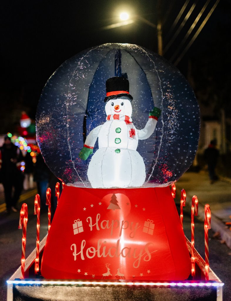 A snowman in a snow globe in Lynn's Christmas Eve Parade.