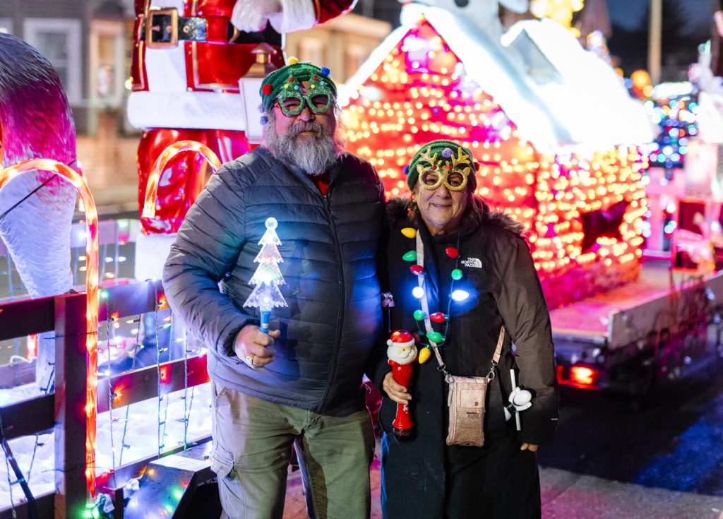 Jay and Yvonne Ramsey stand with a float in the Lynn Christmas Eve Parade.
