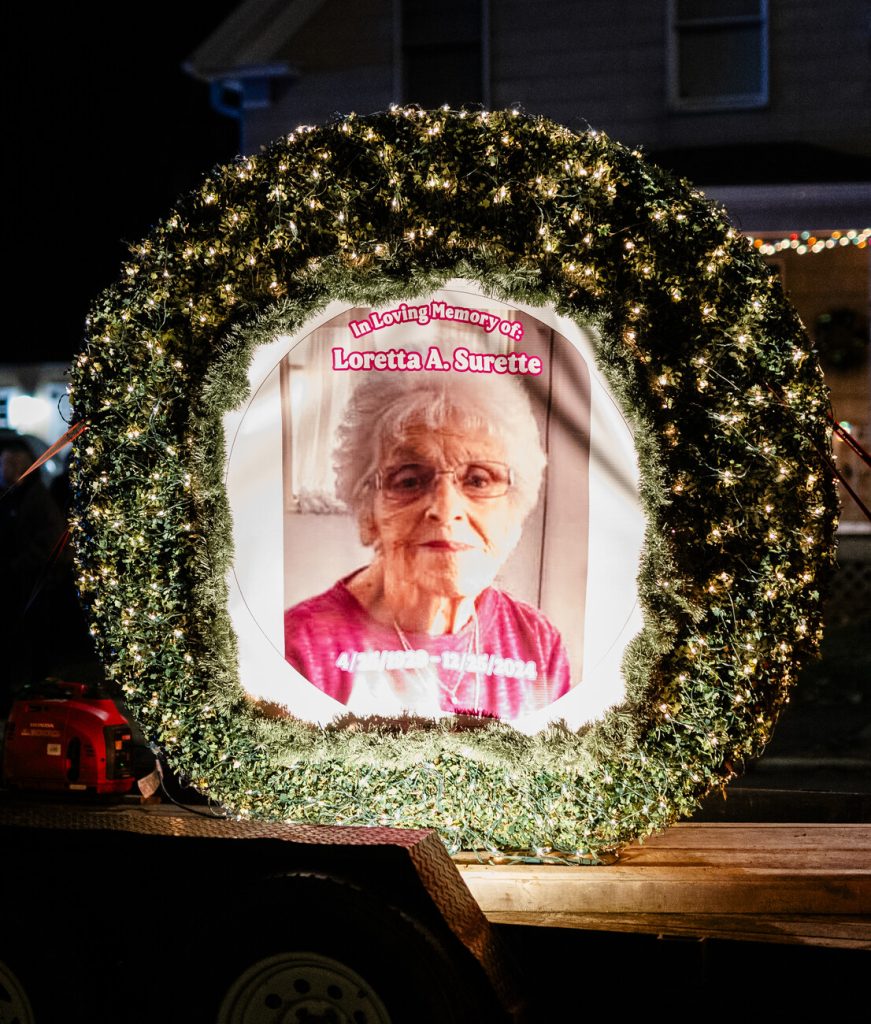 A float dedicated to Loretta A. Surette in Lynn's Christmas Eve Parade.
