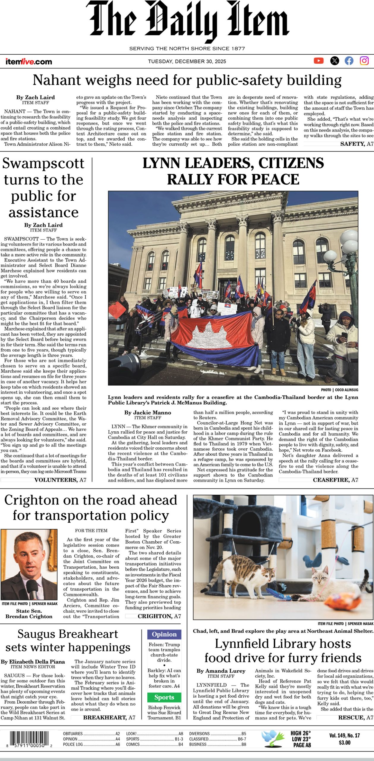 Today’s page 1: 12-30-25 Daily Item StaffDecember 29, 2025 by Daily Item Staff Daily Item Staff View all posts Related posts: No related posts.