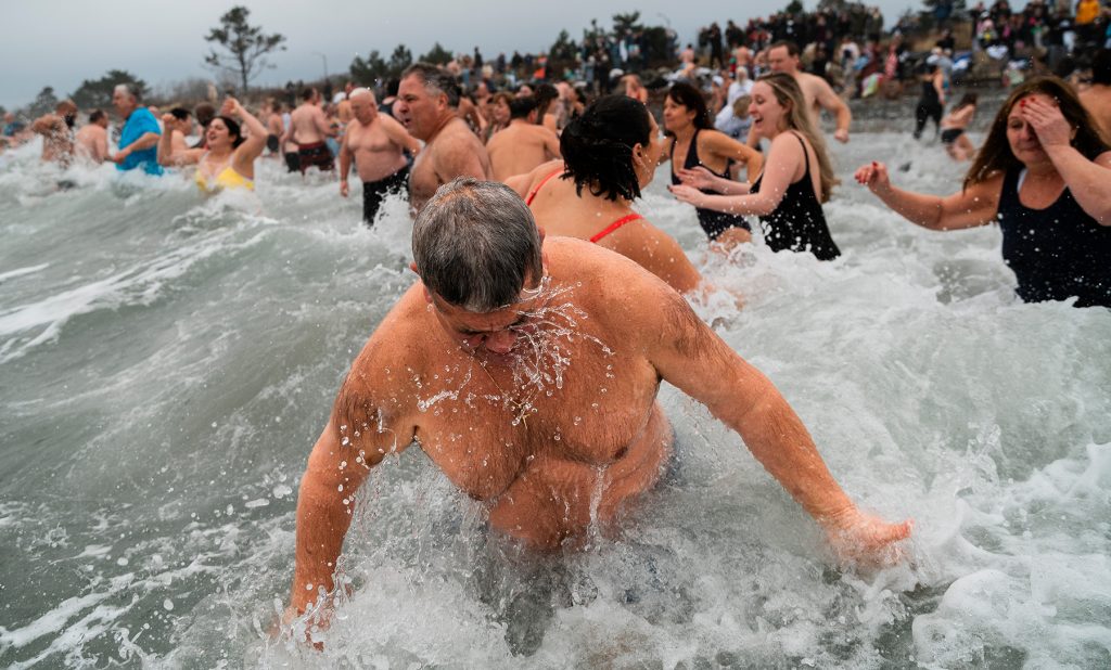 Freezin' for a Reason co-organizer Mario Capano shakes off after plunging under the water at Short Beach in Nahant on New Year's Day.