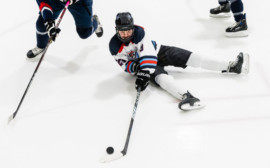 Saugus' Demetri Breton makes a play on the puck as he slides across the ice.