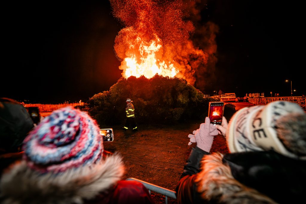 Spectators take phone videos and photos as the fire dances across the Christmas trees burning in Marblehead's Annual Epiphany Tree Burning at Riverhead Beach on Monday.