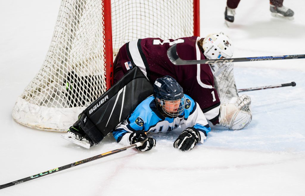 PLNR's Chloe Gromko follows her shot into the net after scoring on Falmouth.
