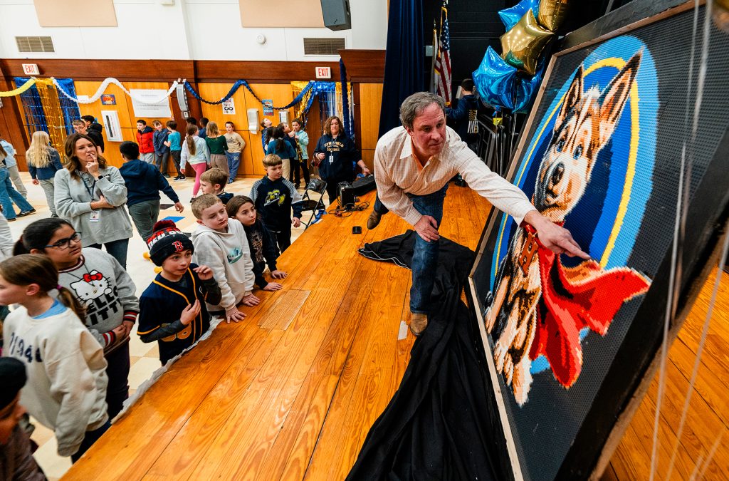 Artist Rob Surrette points out sections of the Huckleberry Hill School Hero mascot that students assembled out of 40,000 LEGO bricks.