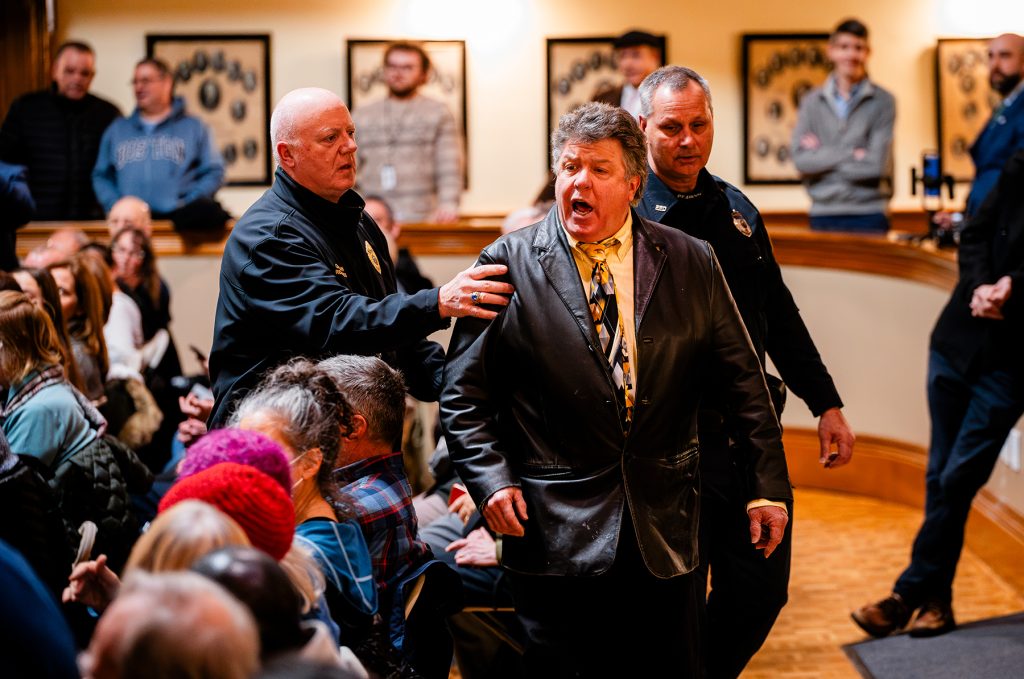 A man is thrown out of U.S. Rep. Seth Moulton's town hall meeting at Peabody City Hall by Peabody Police Tuesday evening after causing a scene and refusing to calm down.