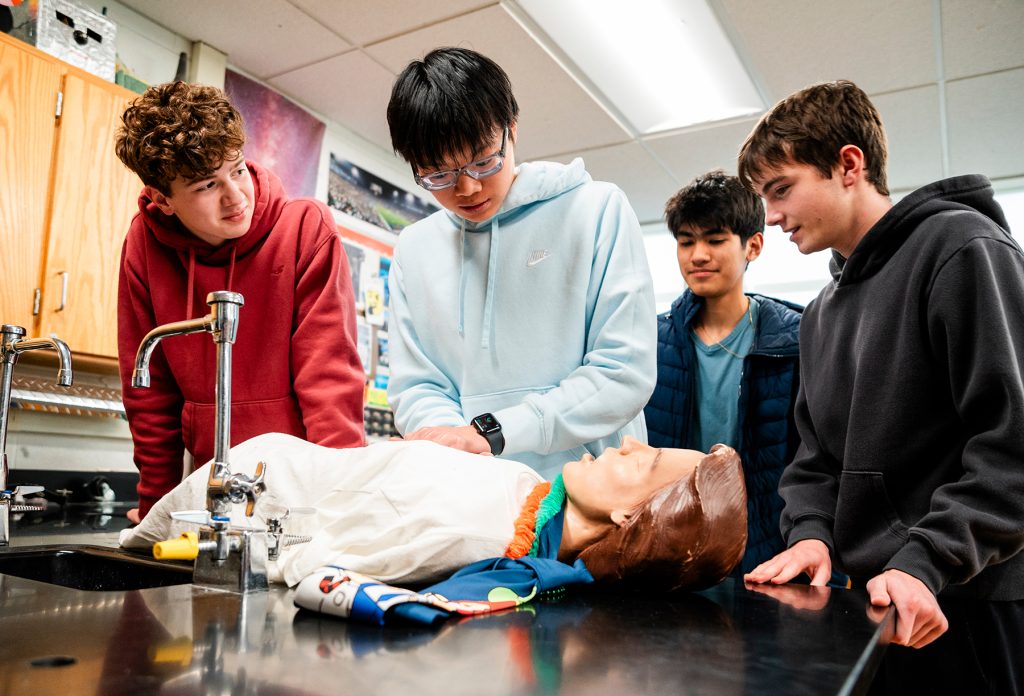 Students of America Club co-founder Jason Tran, second from left, teaches, from left, Luke Moschella, Andrei Pena, and Rowan Atkinson, the proper technique for performing CPR.
