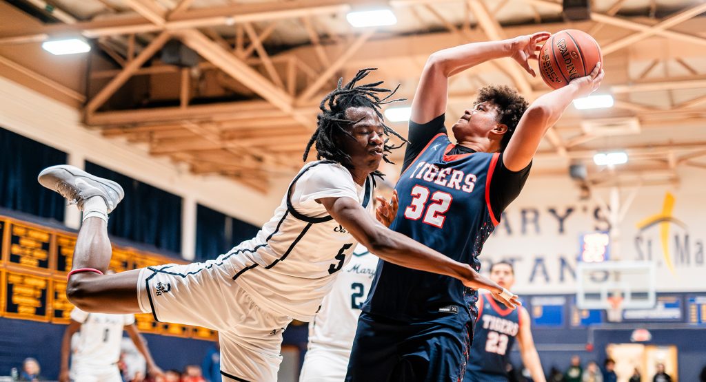 Lynn Tech's Ulices Diaz draws a foul as St. Mary's Donel Kabongo Mutombo comes crashing down on him.