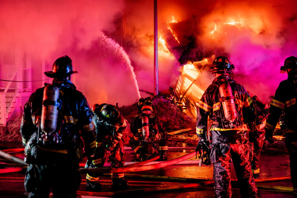A crew works to knock down flames after a five-alarm fire caused the building at 60 Estes St., to collapse Friday night.
