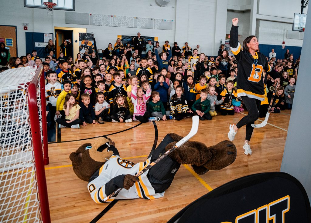 Huckleberry Hill School principal Lauren King celebrates her goal against Blades as the rest of the school cheers her on.