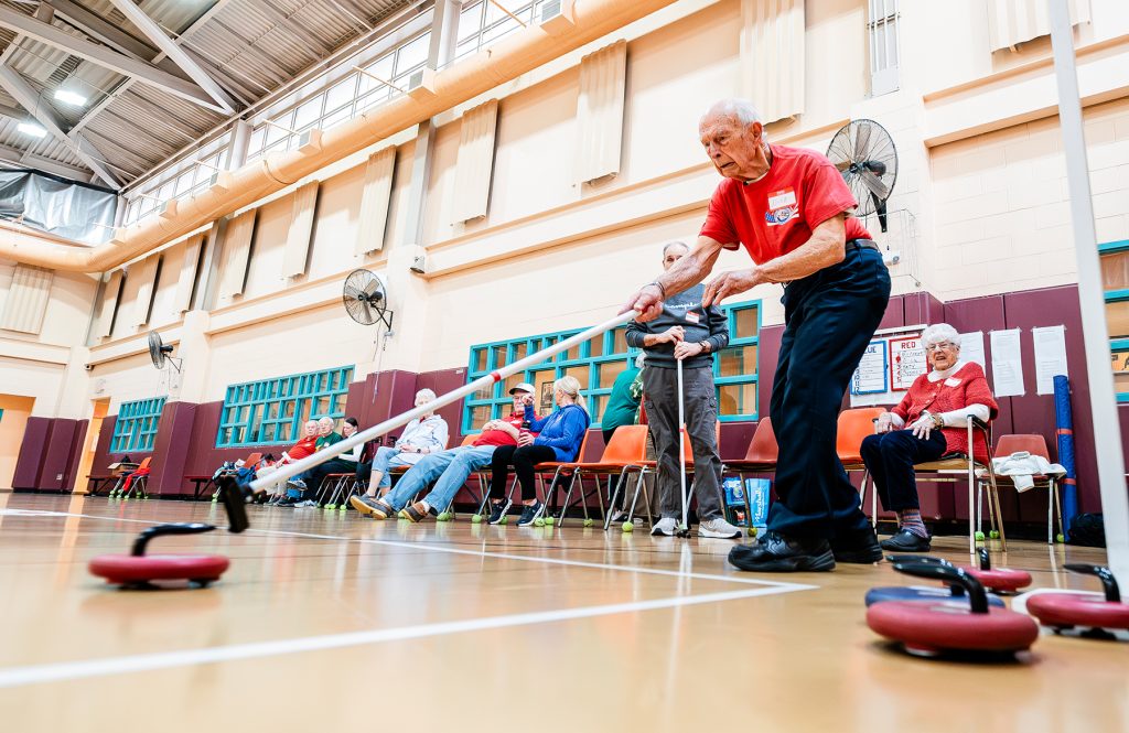 Dick Winter takes part in the indoor curling event at Marblehead Council on Aging.