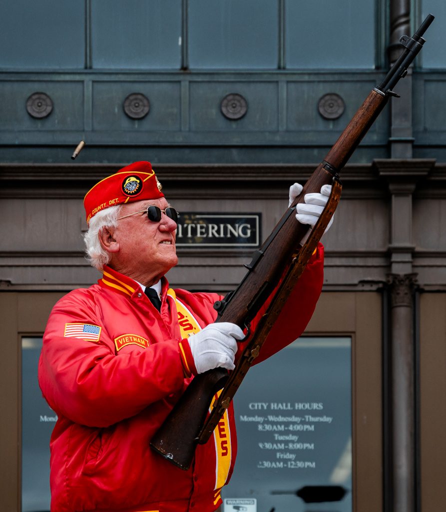 Bob Lennon, a member of the Essex County Marine Corps League, fires a volley to honor Lynn veterans who gave their lives during the Vietnam War.