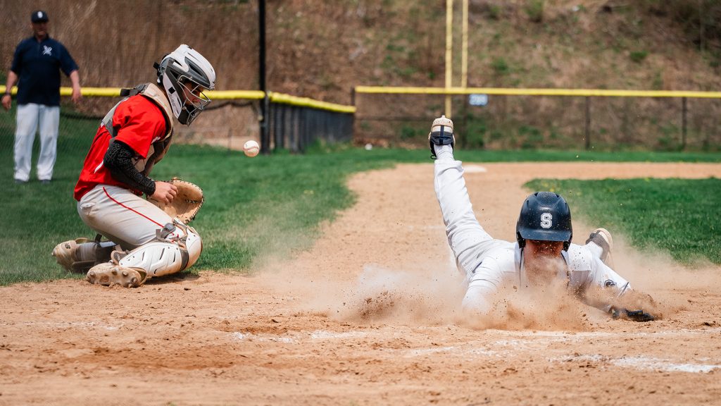 Swampscott's Adam Sparacio dives head-first into home to score Big Blue's first run against Saugus as the ball bounces away from Nathan Soroko.