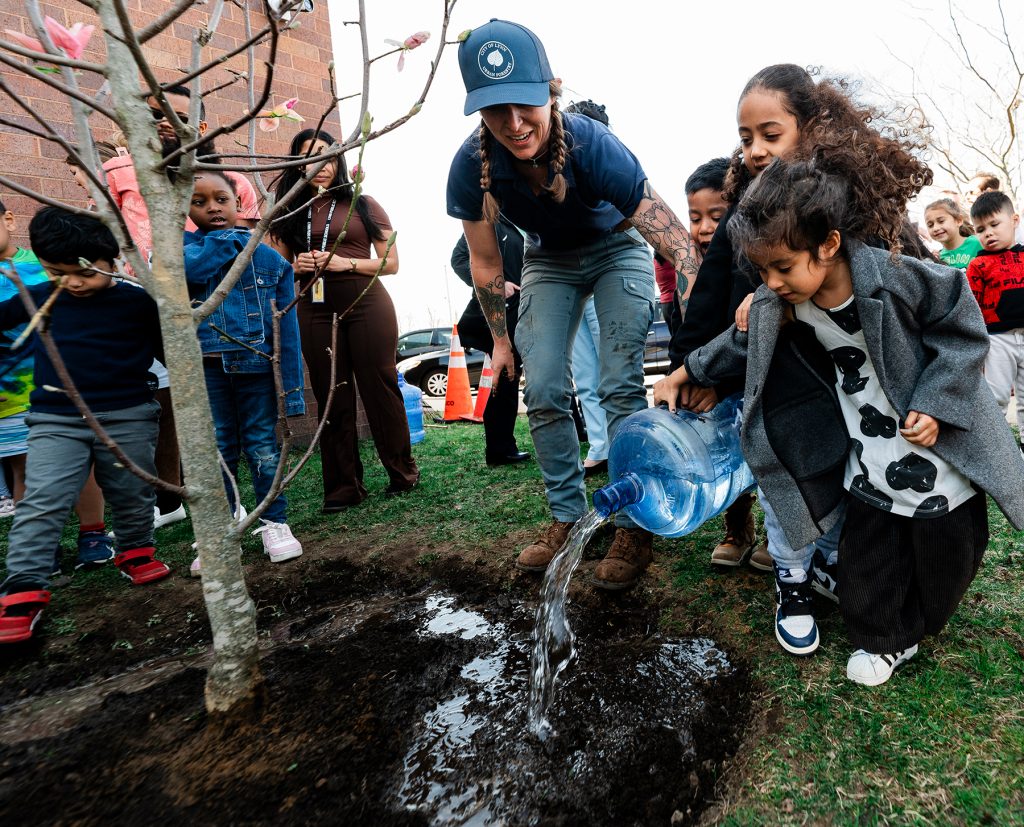 Lynn Urban Forestry Fellow Erica Holm helps pre-schoolers from Lynn's Early Childhood Center, from left, Elvin Maldonado Pojoy, Meziah Gonzalez, and Rosalie Pineda water the freshly planted Magnolia Galaxy tree during the Arbor Day celebration on Tuesday.
